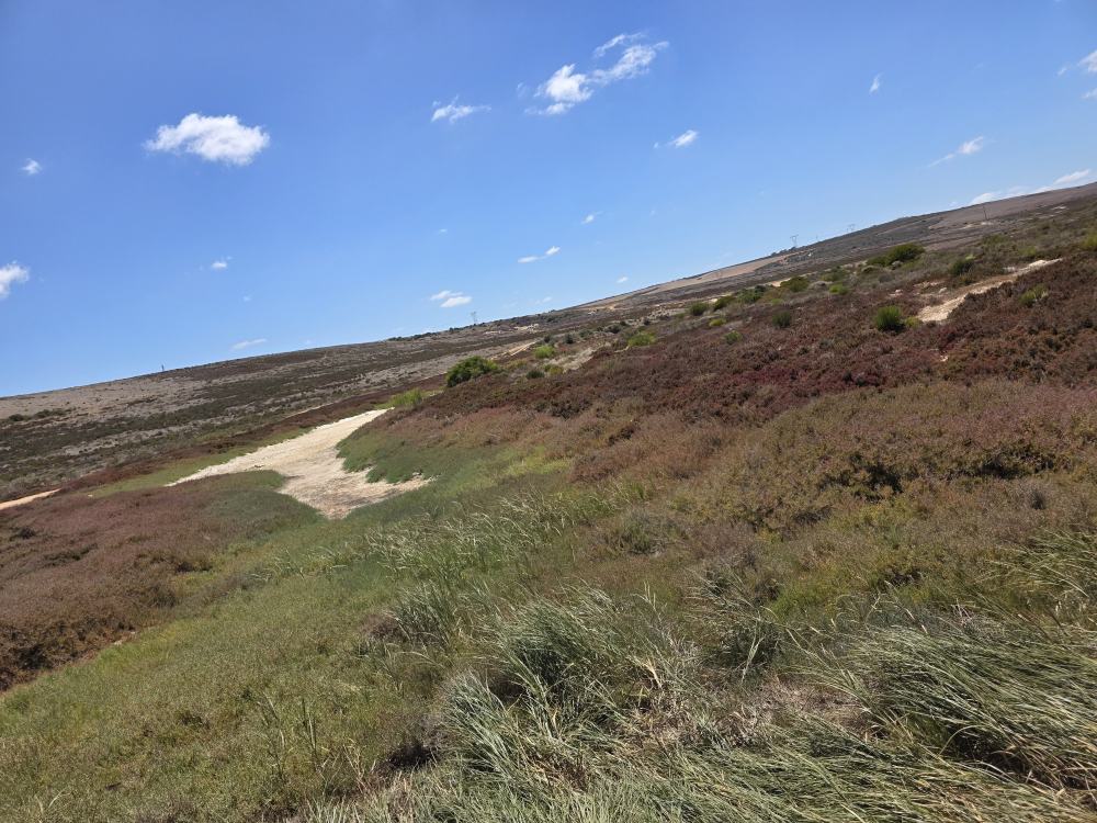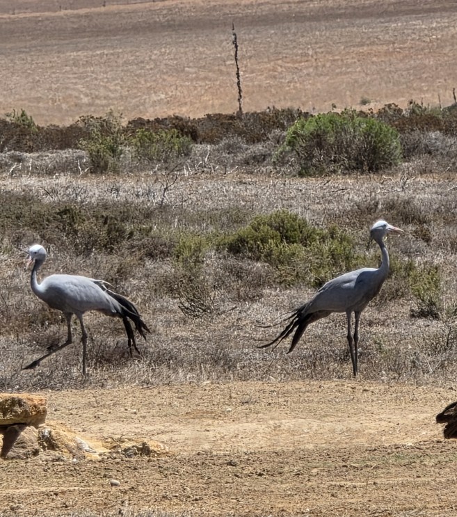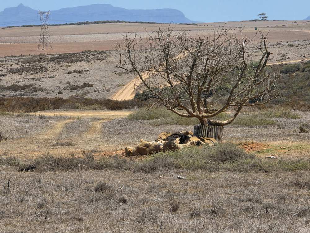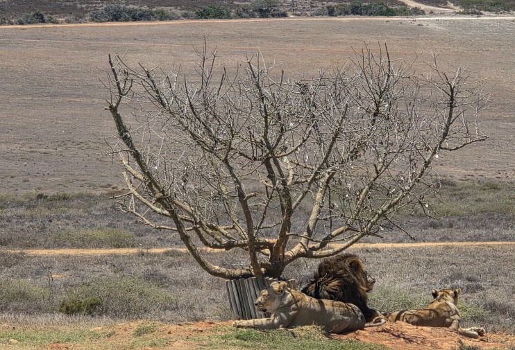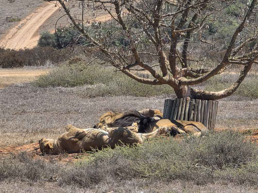 Over hill and dale we continue, through a pretty heather field and up onto a rise where the rest of the lion pride is resting under the only tree around for miles. There is precious little shade, but it is all that have, so here they lay. Two females and a male lounge about, occasionally lifting rolling over to show us their sleeping poses. Alongside are 2 huge Blue Cranes, the national bird of S. Africa. (Brave birds those!)