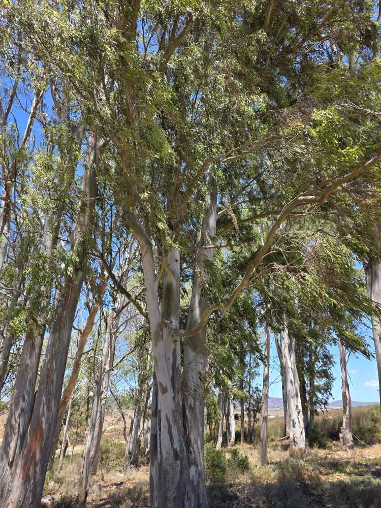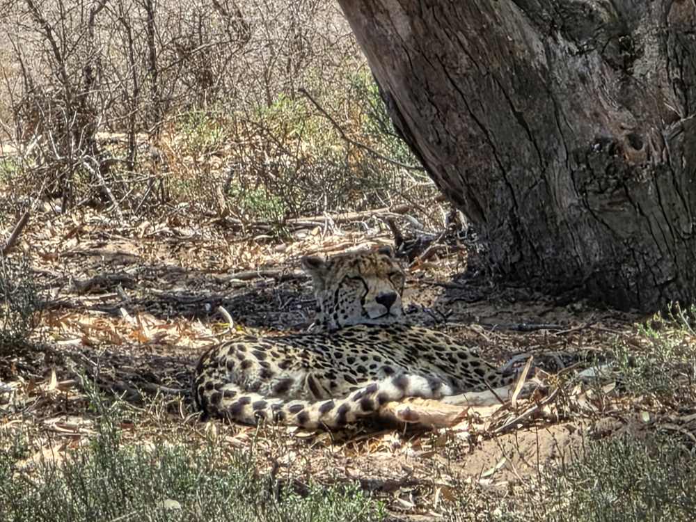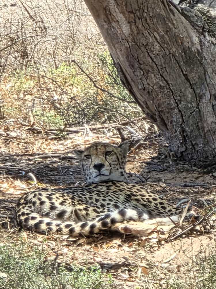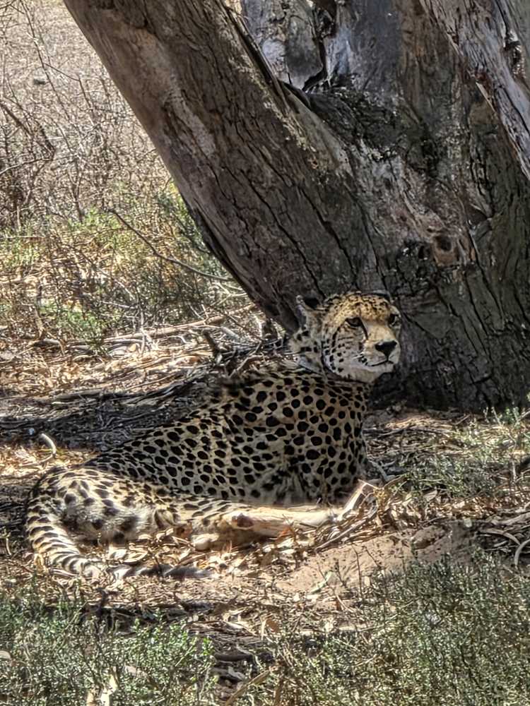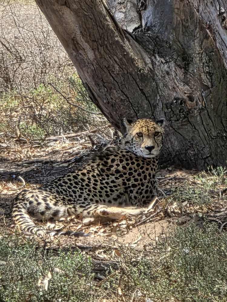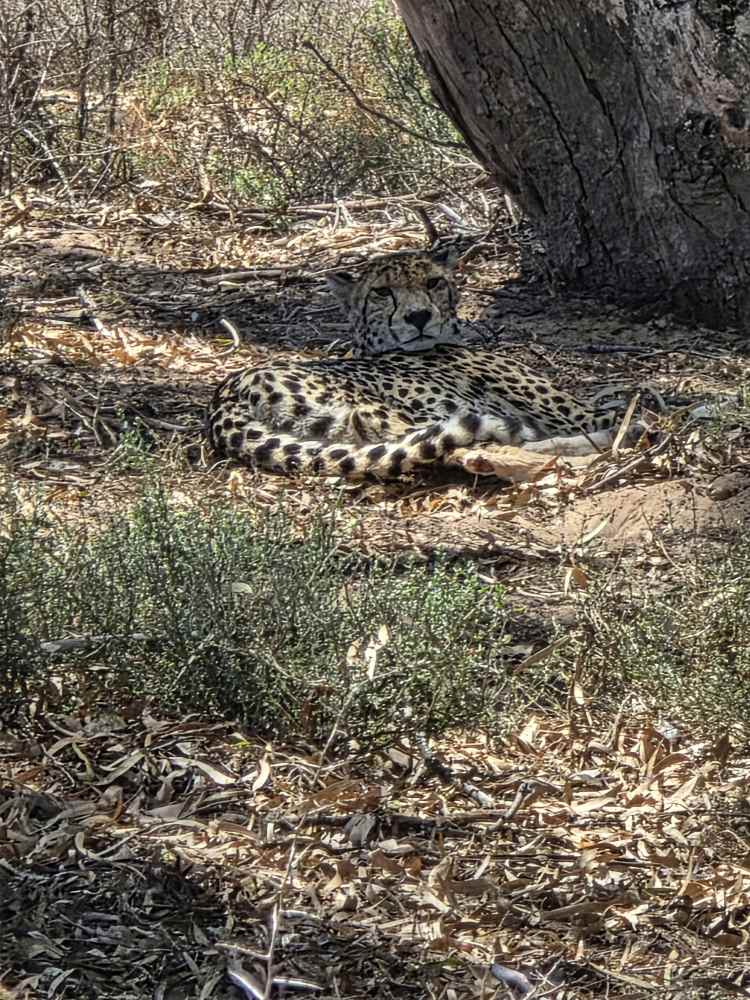 Then, we round a corner, coming into a big Eucalyptus stand and we find the cheetah. Yes! She is just lounging around in the shade underneath one of the trees. Perfectly camouflaged, her spots blending right into the sandy ground and dabbled sunlight. So elegant and pretty. I’d say feline, but that’s just a bad pun.