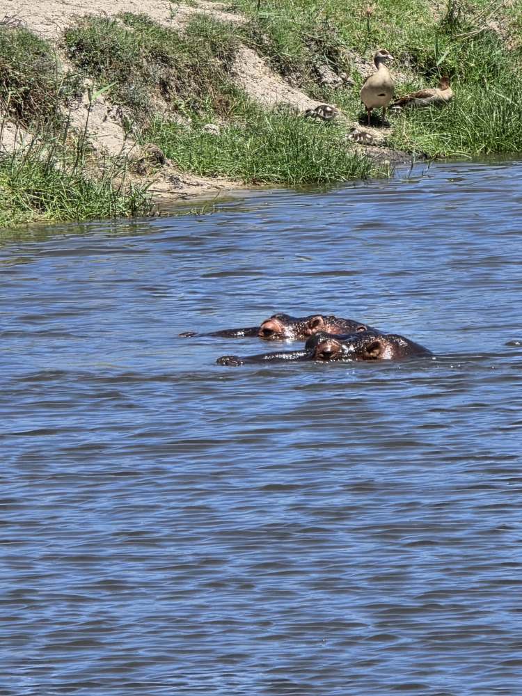 Beneath the trees, there is a rather large watering hole where 2 hippos reside – and we can catch them as they come up to breath – only those huge eyes and snout come out of the water to greet us.