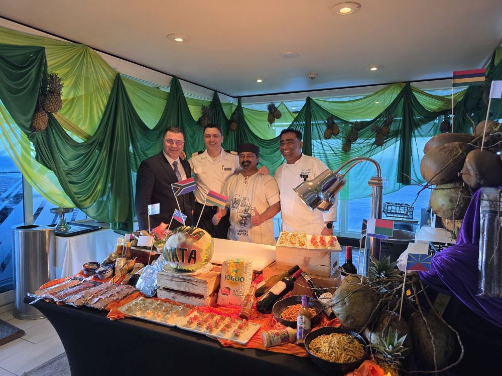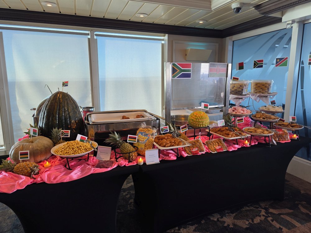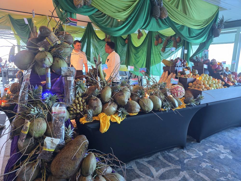 Back aboard, we hit the gym and freshen up, then go directly to Windows because tonight is Chef Sri’s big S. African Destination showcase and he has promised surprises. And oh boy does he deliver! We are the first ones up there – because we do not want to miss anything. Not that we want to eat at 6pm, but we also don’t want to miss out. So…..5:45 we are safely ensconced on the Sunset back deck at a great table out of the sun and ready for the feast. Oh what a feast it is; tons and tons of S. African dishes, an amazing fruit section – including freshly cut coconuts for juice (straw in the coconut and all) and the best Jackfruit (far better than last time, it has finally ripened) – with the best decorations, a fabulous dessert table with Malva pudding (yes!) and Koeksisters (those yummy deep fried S. African cakes) and Pampoenkoekie (freshly made pumpkin fritters). Oh, so very, very good! Excellent!!!