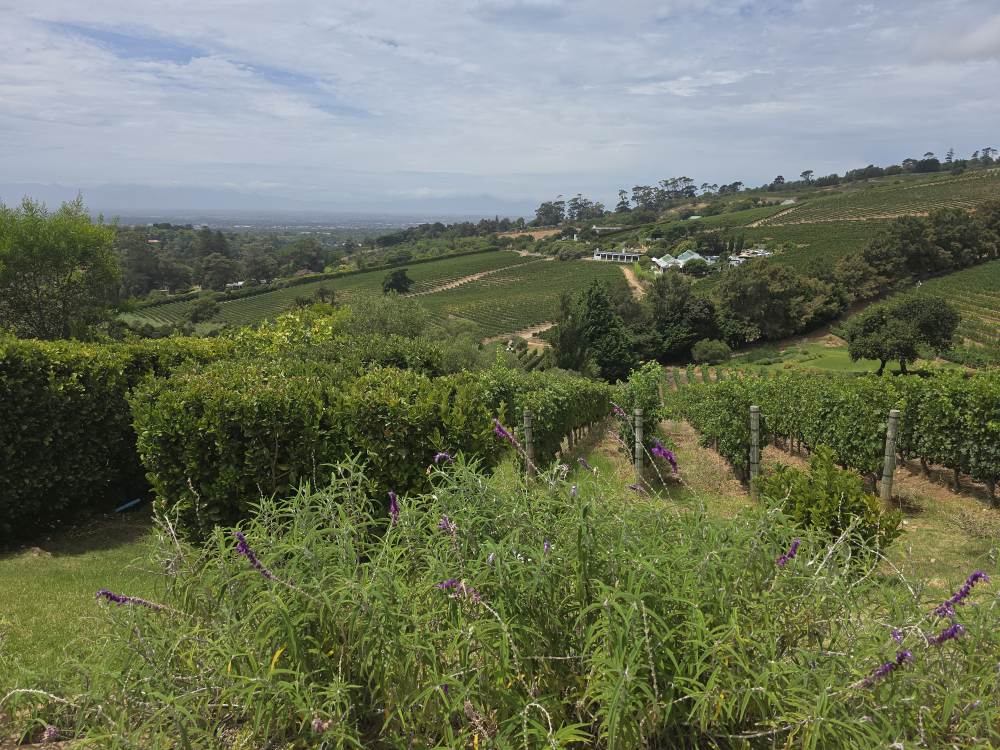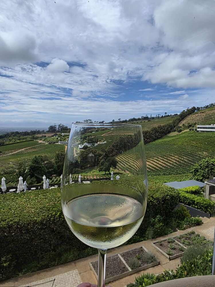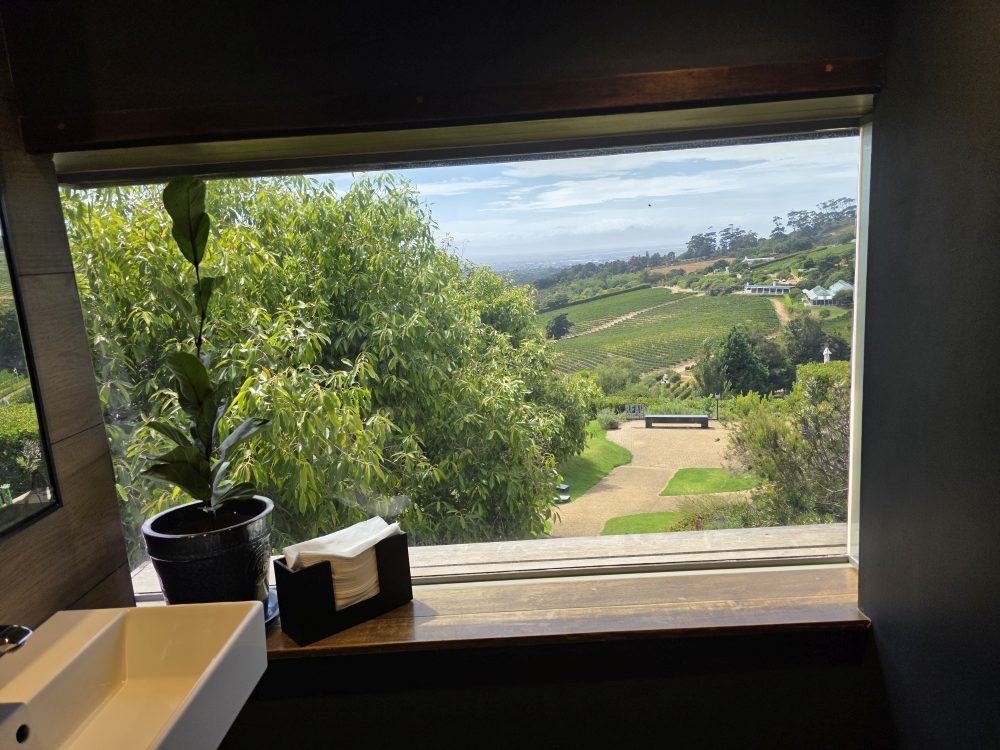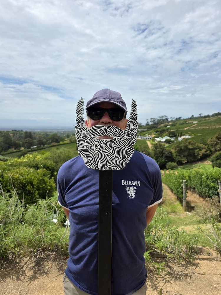 Lunch and tasting over, we hit the Loo with a View, then wander about the property taking various selfies (the one with Ed and the original Winemaker’s beard is the best) and photos of grapes and vistas, then head for the HoHo bus and back to Cape Town.