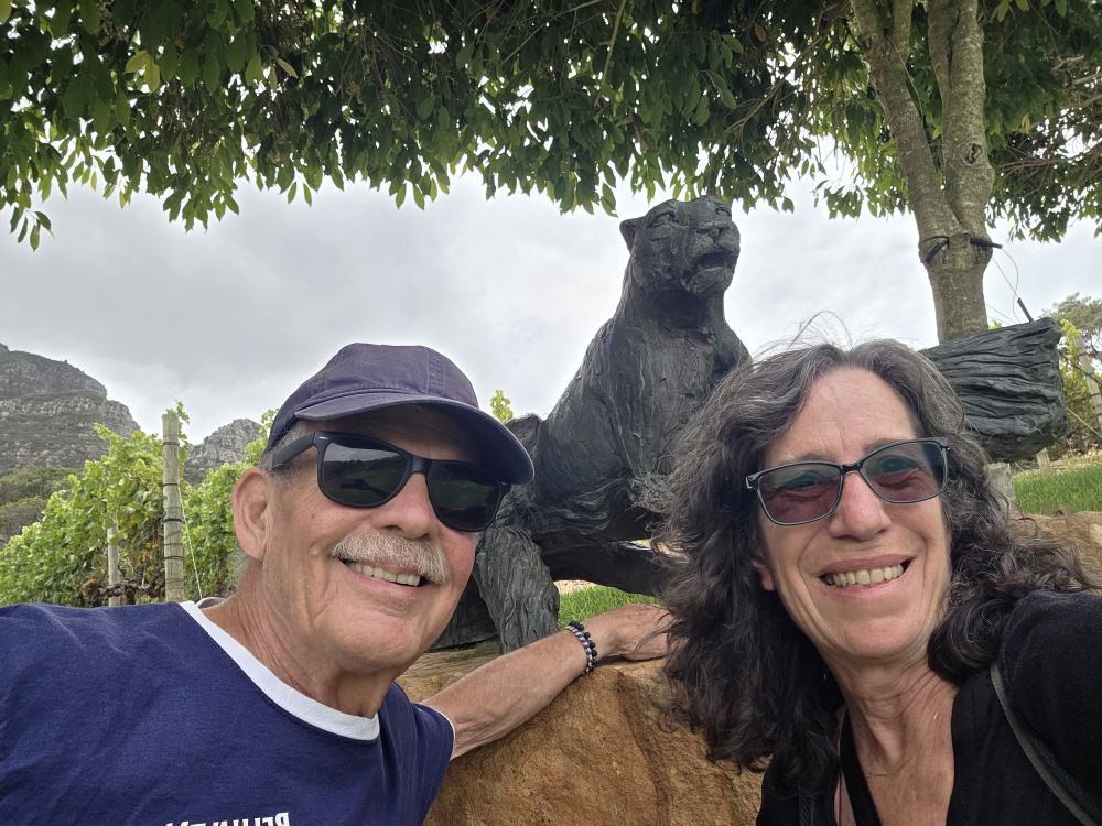 Arriving at V&A, today we have time to shop, which we do, hitting the Aquarium gift shop first for replacement Save the Penguins bracelets and others, then finding our Tiger’s Eye bracelets in the V&A marketplace at a better price than Hout Bay, finally ending up in the mall for the Woolworth’s and Pick and Pay where we grab wine and biltong and Mrs. Balls’ Fruit Chutney (which Alan from PE says is the ONLY fruit chutney he will eat) before heading back to the hotel, past the cool Cape Town sign in the circle.