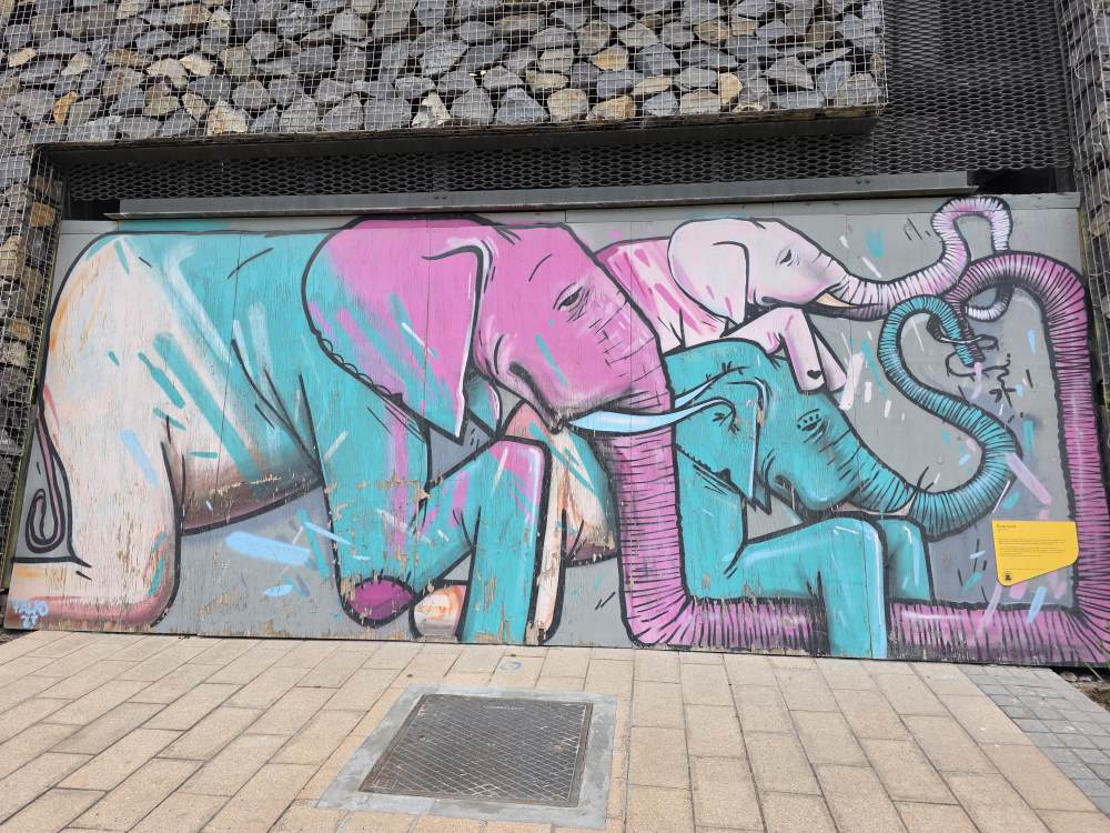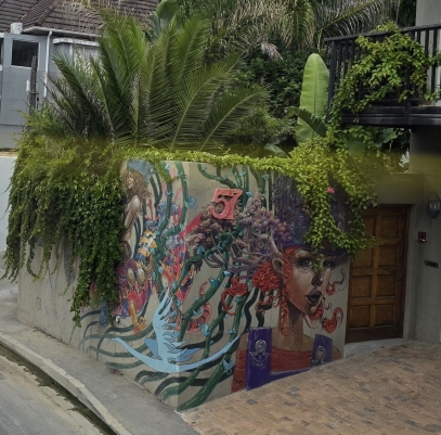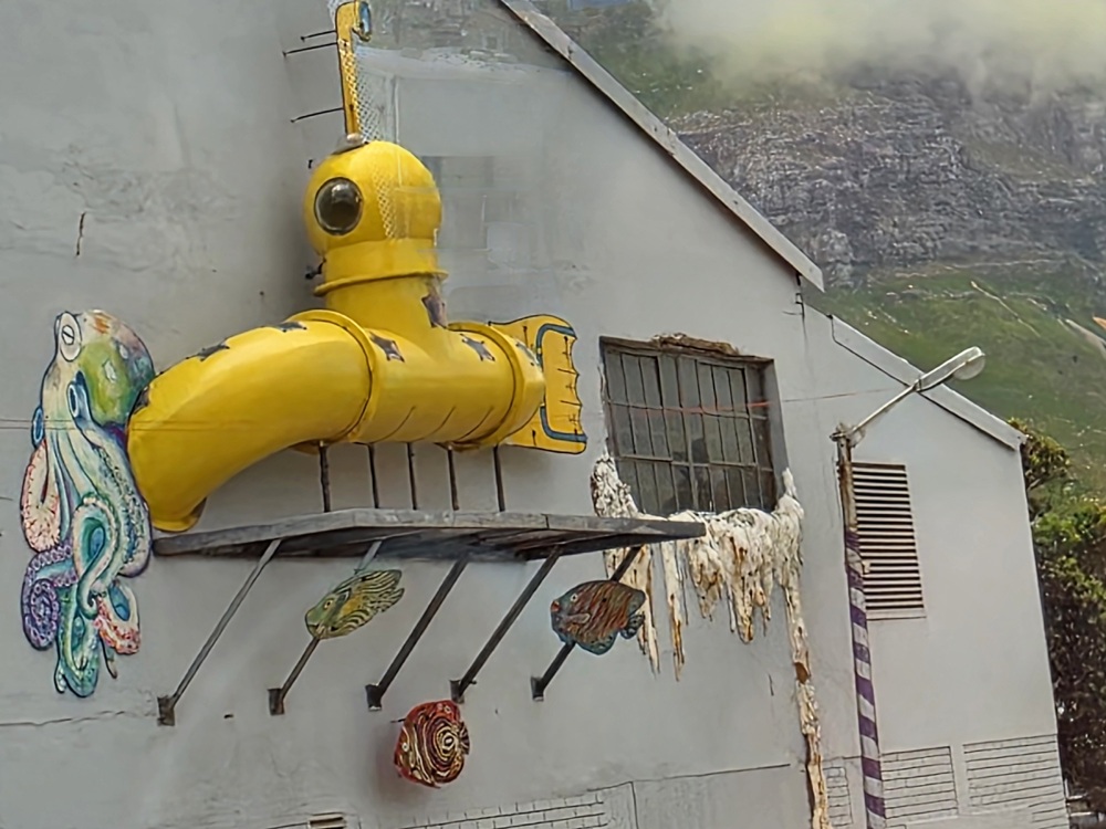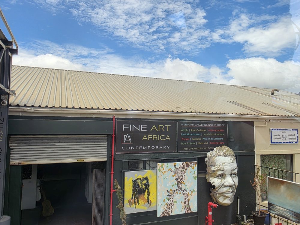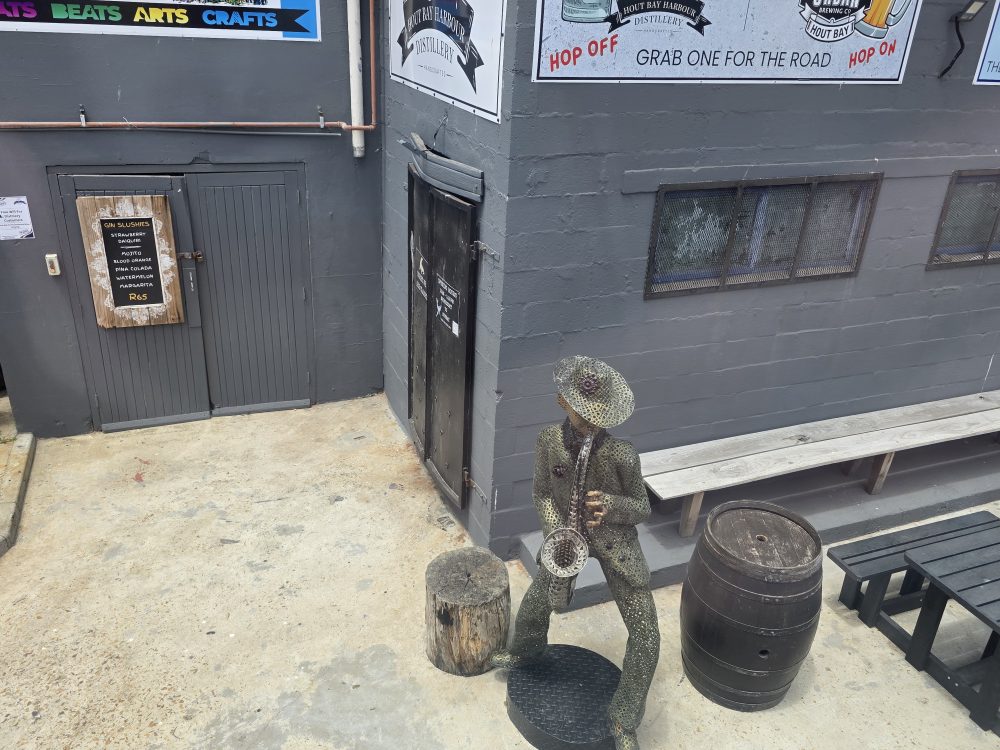 The ride back is lovely – we score some excellent seats at the front of the upstairs of the bus, snapping away as we go through the Imizamo township, stop at the Hout Bay harbor with the cool boat prow at the entrance, go to the new stop at the end of the harbor with lots of take away restaurants and bars, and this really cool art gallery at the bus stop with amazing art.