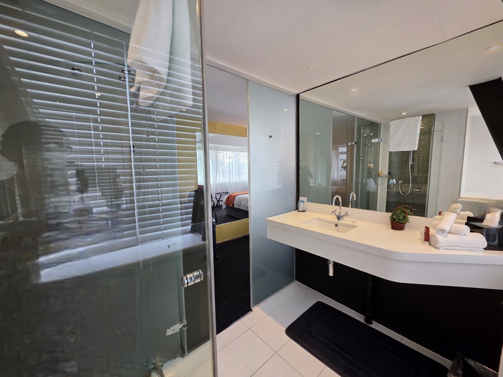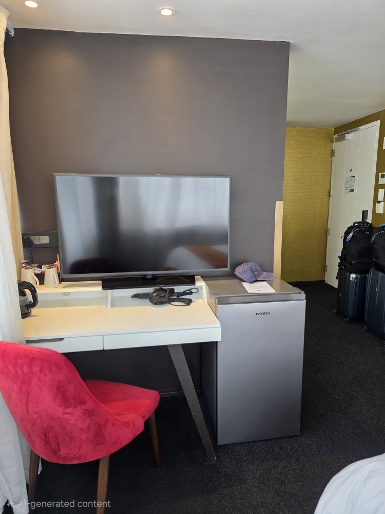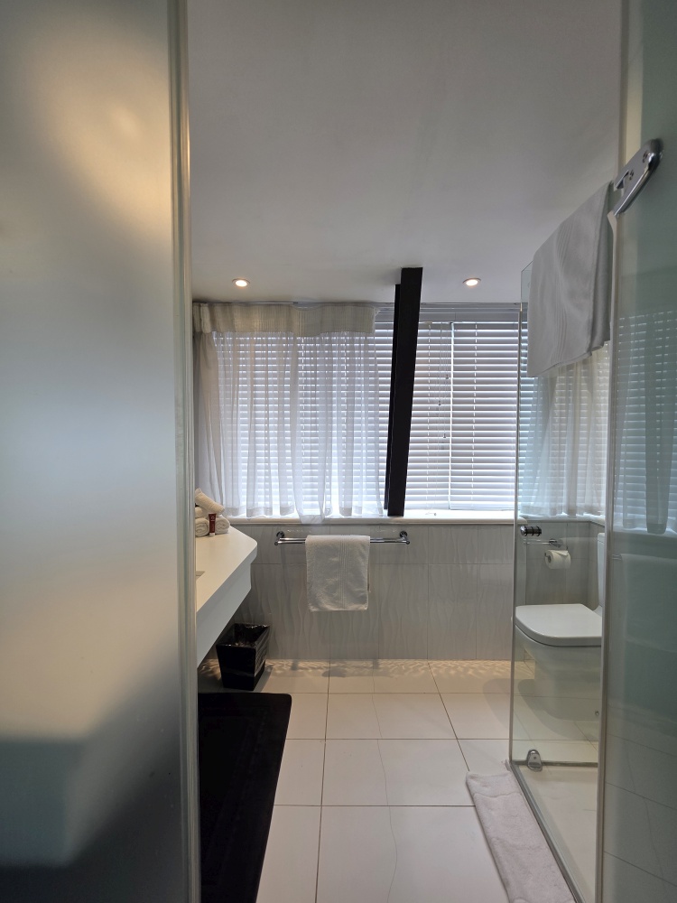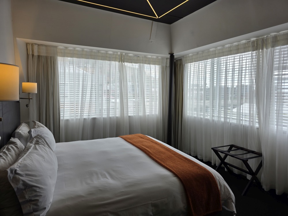 Our room is ready when we arrive, on the 6th floor in a corner with wrap around windows. Great views, fantastic space and a refrigerator that works like a freezer (all the better for our warm beer and wine we have brought!).