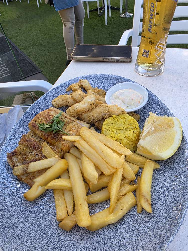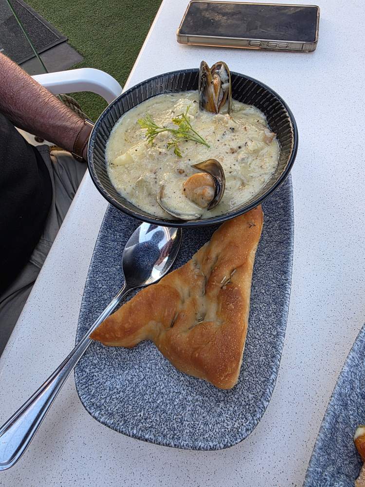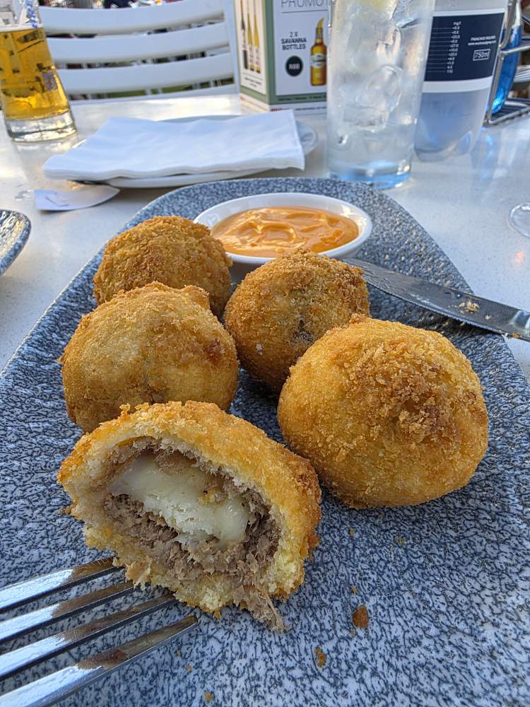 Dinner is at the Cape Town Fish Market – never a disappointment! Sitting on the patio in the shade with a breeze, we enjoy our drinks as we start with Garlic Seafood chowder for Ed and crab and cheese Spring Rolls for me. I had also ordered Lamb croquettes, which the server brought out with the spring rolls, but they were not the slightest bit warm. After asking about it, she told me she’d bring me more which worked perfectly as they arrived with Ed’s grilled Hake, Calamari and chips. Once hot, those lamb croquettes were awesome – but oh so filling! I could barely eat them all – actually I didn’t. Ed had to finish the last one off. His meal was equally awesome and filling and we were very glad we had a long walk back to the hotel!
